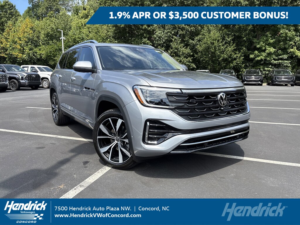APR for well qualified customers *1.9% APR, no down payment required, available on new, unused 2025 Atlas models financed by Wells Fargo through participating dealers. Example: For 1.9% APR, monthly payment for every $1,000 you finance for 60 months is $17.48. Not all customers will qualify for credit approval or advertised APR. Subject to credit approval by Wells Fargo. Offer ends November 3, 2025. Offer not valid in Puerto Rico. See your participating Volkswagen dealer for details or, for general product information, call 1-800-Drive-VW. ©2025 Volkswagen of America, Inc. **Volkswagen of America, Inc. will apply a $3,500 Customer Bonus when you lease or purchase a new, unused 2025 Atlas through participating dealers from September 3, 2025 to November 3, 2025. Bonus cannot be combined with discounted Volkswagen Financial Services Special Lease or Wells Fargo Special APR Programs, or on Fleet or Dealership Sale Program vehicles. Bonus applied toward lease or purchase and is not redeemable for cash. See your participating Volkswagen dealer for details or, for general product information, call 1-800-Drive-VW. ©2025 Volkswagen of America, Inc.
