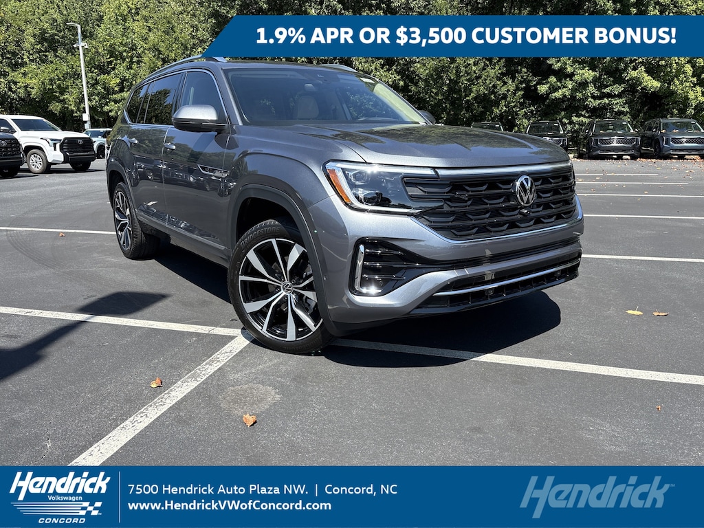 APR for well qualified customers *1.9% APR, no down payment required, available on new, unused 2025 Atlas models financed by Wells Fargo through participating dealers. Example: For 1.9% APR, monthly payment for every $1,000 you finance for 60 months is $17.48. Not all customers will qualify for credit approval or advertised APR. Subject to credit approval by Wells Fargo. Offer ends November 3, 2025. Offer not valid in Puerto Rico. See your participating Volkswagen dealer for details or, for general product information, call 1-800-Drive-VW. ©2025 Volkswagen of America, Inc. **Volkswagen of America, Inc. will apply a $3,500 Customer Bonus when you lease or purchase a new, unused 2025 Atlas through participating dealers from September 3, 2025 to November 3, 2025. Bonus cannot be combined with discounted Volkswagen Financial Services Special Lease or Wells Fargo Special APR Programs, or on Fleet or Dealership Sale Program vehicles. Bonus applied toward lease or purchase and is not redeemable for cash. See your participating Volkswagen dealer for details or, for general product information, call 1-800-Drive-VW. ©2025 Volkswagen of America, Inc.