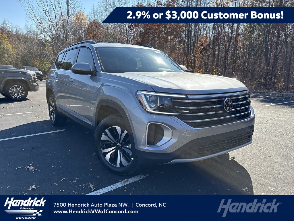 Excludes tax, title, license, options, and dealer fees. Example lease: $599/month for 36 months for well-qualified customers on approved credit through Volkswagen Financial Services and participating dealers for a new, unused 2026 Atlas SE Tech FWD. Based on MSRP of $43,730 (including destination charge) with a capitalized cost of $44,838.54; total monthly payments $20,965. Lessee responsible at lease end for $395 disposition fee, $0.20 per mile over 30,000 miles, and excess wear and use. A $395 fee applies if you purchase your lease vehicle. 0.9% APR for 60 months, no down payment required, available on new, unused 2025 Atlas models financed through Wells Fargo and participating dealers; example: $17.05 per $1,000 financed. Subject to credit approval; not all customers will qualify. Volkswagen of America, Inc. will apply a $3,500 Customer Bonus toward the lease or purchase of a new, unused 2025 Atlas from November 1, 2025, to January 5, 2026. Bonus cannot be combined with Volkswagen Financial Services Special Lease, Wells Fargo Special APR, Fleet, or Dealership Sale Program vehicles and is not redeemable for cash. Offers end January 5, 2026. Offers not valid in Puerto Rico. See participating Volkswagen dealer for details or call 1-800-DRIVE-VW. ©2025 Volkswagen of America, Inc.