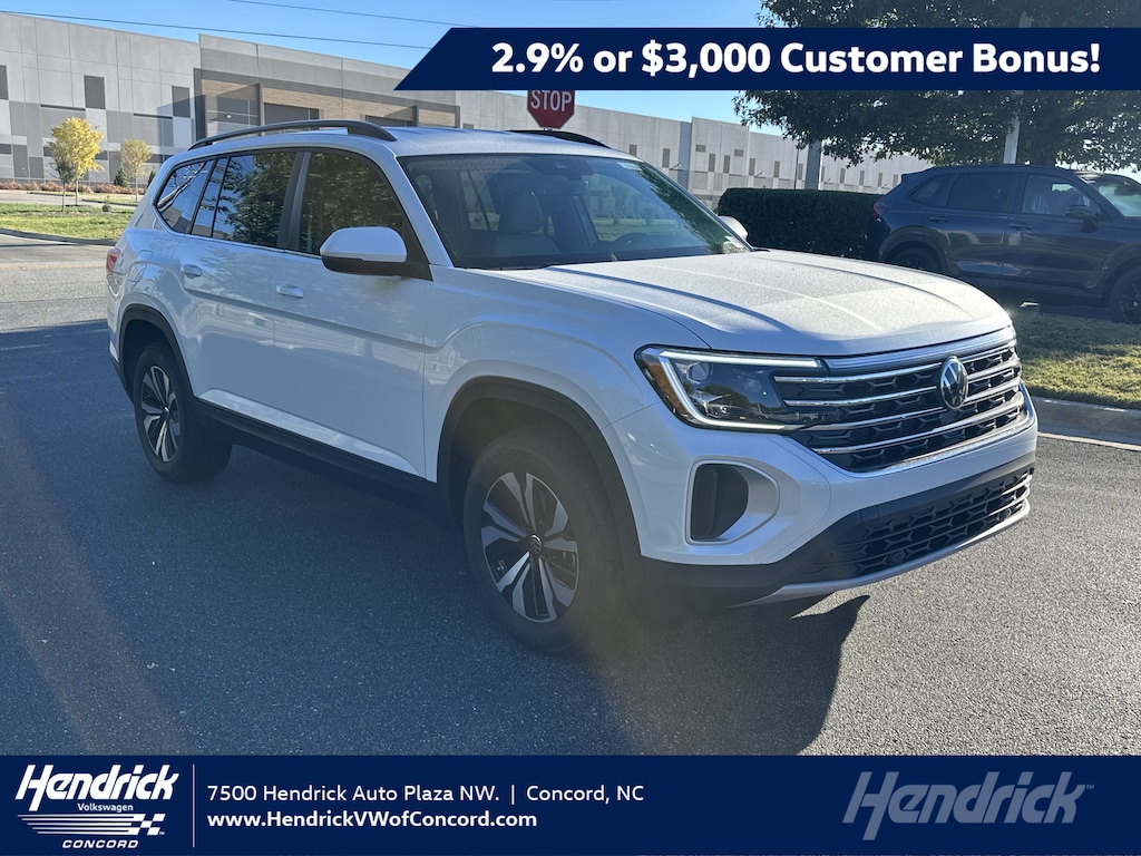 Excludes tax, title, license, options, and dealer fees. Example lease: $599/month for 36 months for well-qualified customers on approved credit through Volkswagen Financial Services and participating dealers for a new, unused 2026 Atlas SE Tech FWD. Based on MSRP of $43,730 (including destination charge) with a capitalized cost of $44,838.54; total monthly payments $20,965. Lessee responsible at lease end for $395 disposition fee, $0.20 per mile over 30,000 miles, and excess wear and use. A $395 fee applies if you purchase your lease vehicle. 0.9% APR for 60 months, no down payment required, available on new, unused 2025 Atlas models financed through Wells Fargo and participating dealers; example: $17.05 per $1,000 financed. Subject to credit approval; not all customers will qualify. Volkswagen of America, Inc. will apply a $3,500 Customer Bonus toward the lease or purchase of a new, unused 2025 Atlas from November 1, 2025, to January 5, 2026. Bonus cannot be combined with Volkswagen Financial Services Special Lease, Wells Fargo Special APR, Fleet, or Dealership Sale Program vehicles and is not redeemable for cash. Offers end January 5, 2026. Offers not valid in Puerto Rico. See participating Volkswagen dealer for details or call 1-800-DRIVE-VW. ©2025 Volkswagen of America, Inc.