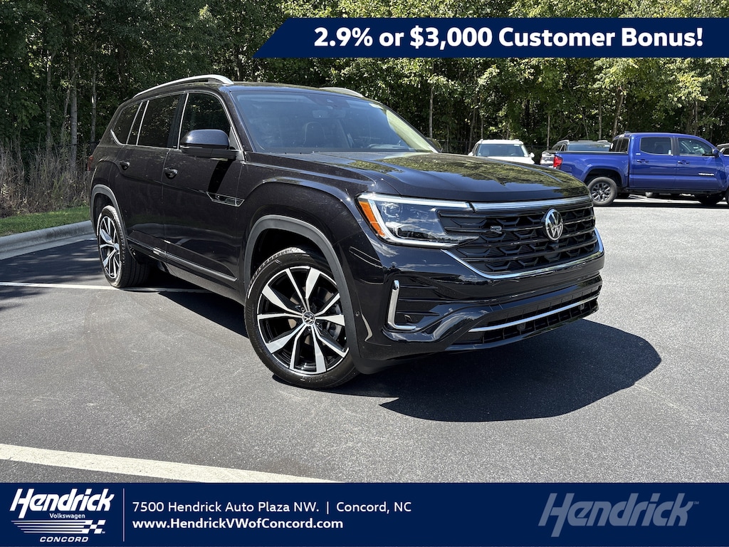 Excludes tax, title, license, options, and dealer fees. Example lease: $599/month for 36 months for well-qualified customers on approved credit through Volkswagen Financial Services and participating dealers for a new, unused 2026 Atlas SE Tech FWD. Based on MSRP of $43,730 (including destination charge) with a capitalized cost of $44,838.54; total monthly payments $20,965. Lessee responsible at lease end for $395 disposition fee, $0.20 per mile over 30,000 miles, and excess wear and use. A $395 fee applies if you purchase your lease vehicle. 0.9% APR for 60 months, no down payment required, available on new, unused 2025 Atlas models financed through Wells Fargo and participating dealers; example: $17.05 per $1,000 financed. Subject to credit approval; not all customers will qualify. Volkswagen of America, Inc. will apply a $3,500 Customer Bonus toward the lease or purchase of a new, unused 2025 Atlas from November 1, 2025, to January 5, 2026. Bonus cannot be combined with Volkswagen Financial Services Special Lease, Wells Fargo Special APR, Fleet, or Dealership Sale Program vehicles and is not redeemable for cash. Offers end January 5, 2026. Offers not valid in Puerto Rico. See participating Volkswagen dealer for details or call 1-800-DRIVE-VW. ©2025 Volkswagen of America, Inc.