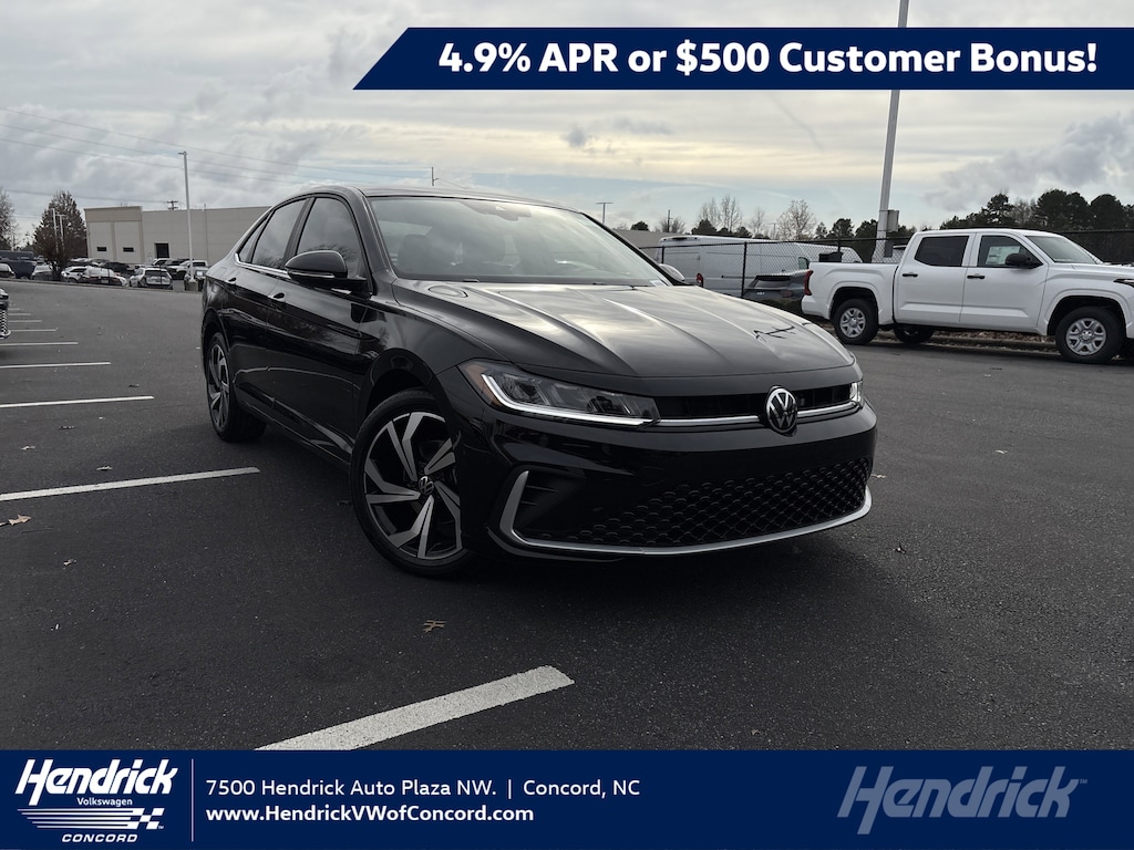 Excludes tax, title, license, options, and dealer fees. Example lease: $359/month for 36 months for well-qualified customers on approved credit through Volkswagen Financial Services and participating dealers for a new, unused 2025 Jetta SE FWD. Based on MSRP of $25,775 (including destination charge) with a capitalized cost of $27,043.94; total monthly payments $12,565. Lessee responsible at lease end for $395 disposition fee, $0.20 per mile over 30,000 miles, and excess wear and use. A $395 fee applies if you purchase your lease vehicle. 2.9% APR for 60 months, no down payment required, available on new, unused 2025 Jetta models financed through Wells Fargo and participating dealers; example: $17.92 per $1,000 financed. Subject to credit approval; not all customers will qualify. Volkswagen of America, Inc. will apply a $500 Customer Bonus toward the lease or purchase of a new, unused 2025 Jetta from November 1, 2025, to January 5, 2026. Bonus cannot be combined with Volkswagen Financial Services Special Lease, Wells Fargo Special APR, Fleet, or Dealership Sale Program vehicles and is not redeemable for cash. Offers end January 5, 2026. Limited inventory available. Offers not valid in Puerto Rico. See participating Volkswagen dealer for details or call 1-800-DRIVE-VW. ©2025 Volkswagen of America, Inc.